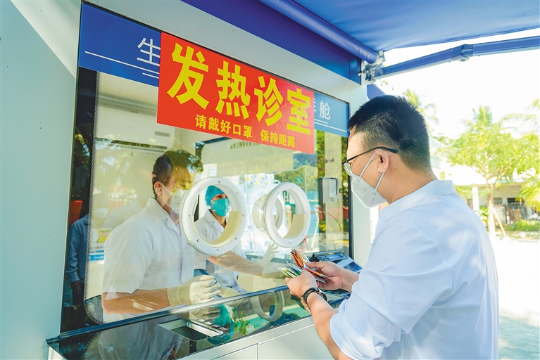 12月25日,在三亚市吉阳区榆红村,市民在由核酸检测小屋改造而成的发热诊室购买药品。三亚吉阳区委宣传部供图