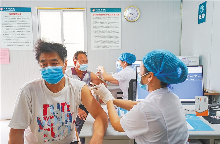 在三亚华侨医院新冠疫苗预防接种点,医务人员为群众接种新冠疫苗。海南日报记者 武威 摄