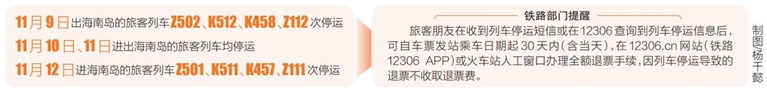 海南日报海口11月8日讯(海南日报全媒体记者 周晓梦 通讯员 黎成)11月8日,海南日报全媒体记者从海南铁路海口车务段获悉,因受台风“银杏”影响,将对海南进出岛旅客列车采取停运措施: