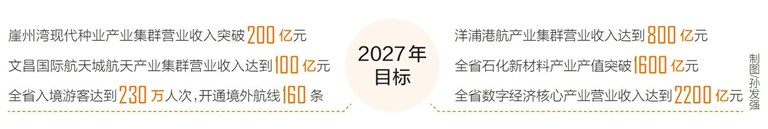 优势产业提升行动也将同步推进。力争到2027年,全省入境游客达到230万人次,开通境外航线160条;洋浦港航产业集群营业收入达到800亿元,全省集装箱吞吐量达600万标箱,稳定运行集装箱班轮航线85条;医疗旅游人数突破150万人次;全省石化新材料产业产值突破1600亿元;全省数字经济核心产业营业收入达到2200亿元。