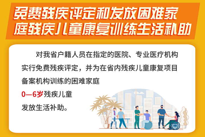 对我省户籍人员在指定的医院、专业医疗机构实行免费残疾评定,并为在省内残疾儿童康复项目备案机构训练的困难家庭0—6岁残疾儿童发放生活补助。