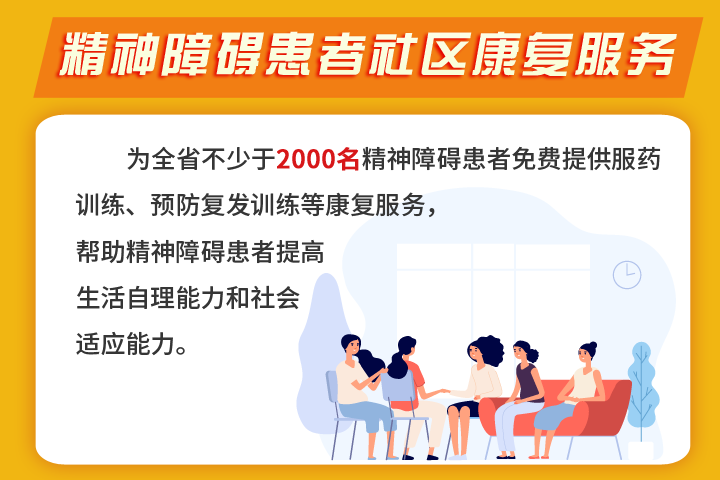 为全省不少于2000名精神障碍患者免费提供服药训练、预防复发训练等康复服务,帮助精神障碍患者提高生活自理能力和社会适应能力。