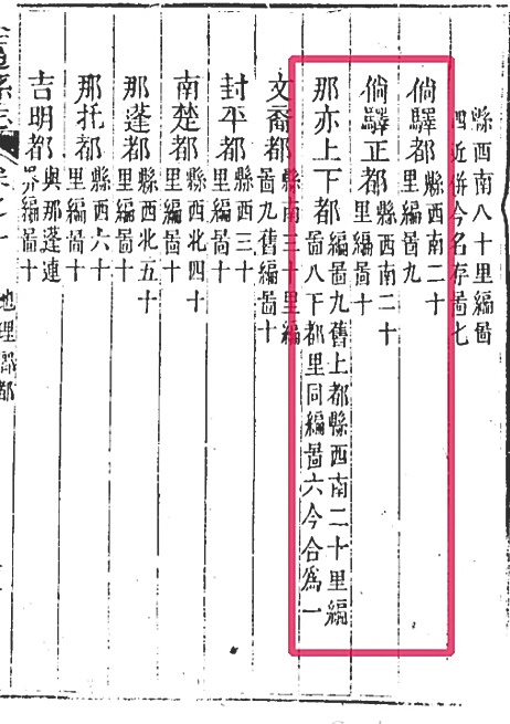 康熙《澄迈县志》载:“倘驿都,县南二十里,编图九。那亦上下都,编图九。”“倘驿市,在倘驿都。”嘉庆《澄迈县志》也记有“倘村市,在倘驿都,今废”。光绪《澄迈县志》在“乡都”编中记载更为详尽:“倘驿都,县西南二十里,编图九。倘驿正都,县西南二十里,编图十。那亦上下都,编图九。旧上都,县西南二十里,编图八;下都里同,编图六。今合为一。”县志记载,这是乾隆年间实施减并的。史志中的“县”,指当年的澄迈县城,位于今老城镇政府至盈滨半岛海湾一带。