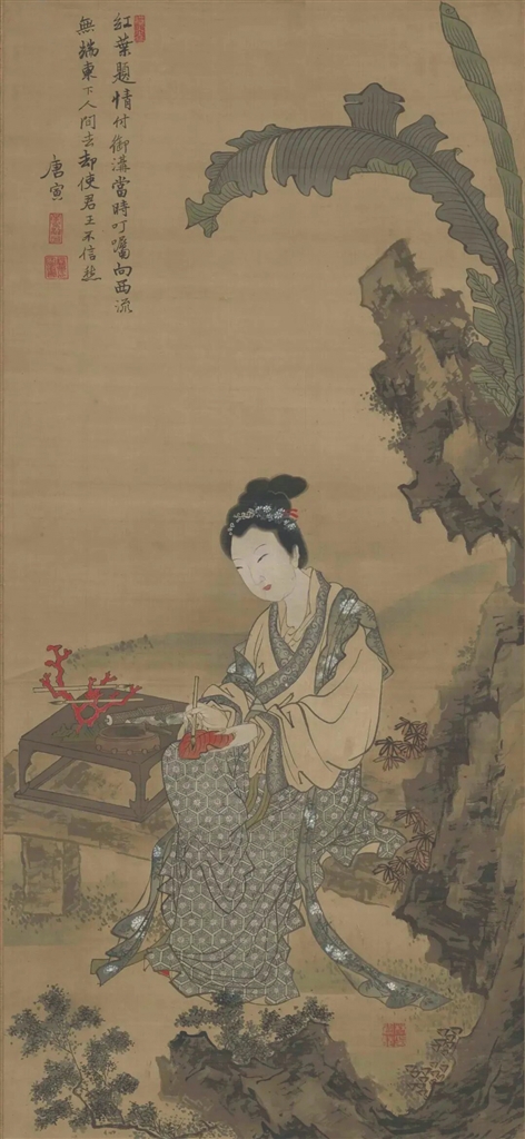在以红叶为题材的画作中,最富人文情趣的,莫过于画家将“红叶题诗”的典故作为创作的来源,通过画面描绘以呈现“红叶题诗”意蕴和人文色彩。在这方面,明代画家唐寅的《红叶题诗仕女图》、明代画家陈洪绶的《红叶题诗图》,就各自从一个侧面艺术展现了“红叶题诗”所蕴含的意趣,不仅给人们带来绘画艺术的享受,也给人们从典故中带来无限的遐思,真可谓情趣盎然,妙趣横生。