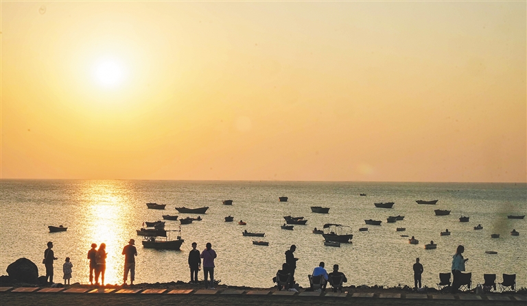 在儋州市峨蔓镇火山海岸地质公园,游客在欣赏落日美景。海南日报全媒体记者 陈元才 摄