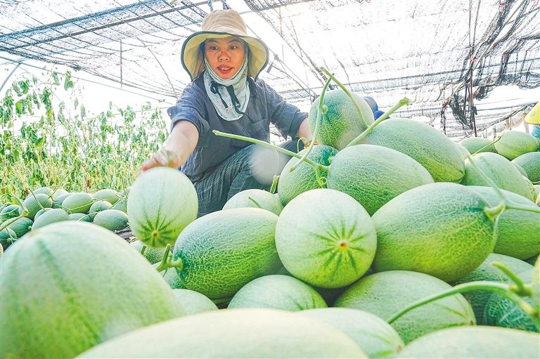 在乐东佛罗镇一家乐东蜜瓜种植基地内,工人们忙着将乐东蜜瓜打包装箱,准备运往岛外。