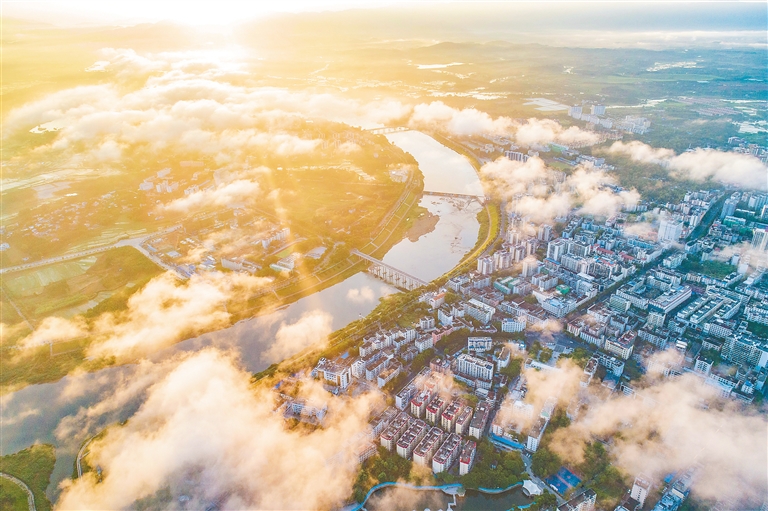 清晨,俯瞰乐东黎族自治县县城,昌化江穿城而过。