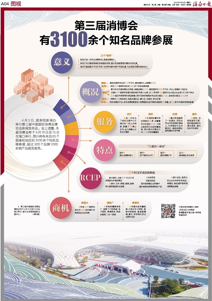 4月3日,国务院新闻办举行第三届中国国际消费品博览会新闻发布会。会上透露,本届消博会将于4月10日至15日在海口举行,预计将有来自65个国家和地区的3100余个知名品牌参展,超过300个品牌1000余款产品首发首秀。