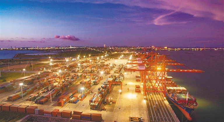 近日,在洋浦经济开发区洋浦港小铲滩码头,港口机械忙着装卸集装箱。2019年洋浦港新开通4条内贸航线和4条外贸航线。截至目前,洋浦港初步形成了国际中转港的航线框架。海南日报记者 陈元才 摄
