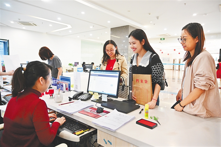 2020年1月7日,海南生态软件园企业服务超市,罗女士(中)半个多小时就完成了企业经营范围的变更手续。海南推行“一园一策”,为园区量身定制个性化扶持政策,把省市两级审批权限直接下放给园区,实行极简审批,让企业享受到了极大便利。海南日报记者 王凯 摄