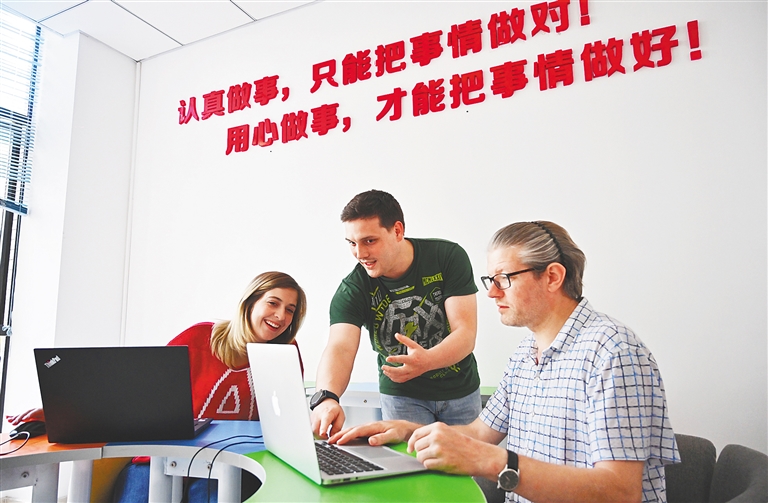 2020年1月7日,在海南迈成教育培训有限公司,来自南非的Brandon(中)正在和同事们讨论授课教案。海南通过开展国际人才管理改革试点,探索建立与国际接轨的全球人才招聘、服务管理制度,完善外国人来华工作许可制度,开展高端人才服务“一卡通”试点,为国(境)外人才来琼创业就业提供政策便利。2019年上半年,外籍国际人才来琼工作和学习居留人数,相比2017年同期增长近70%。海南日报记者 王凯 摄