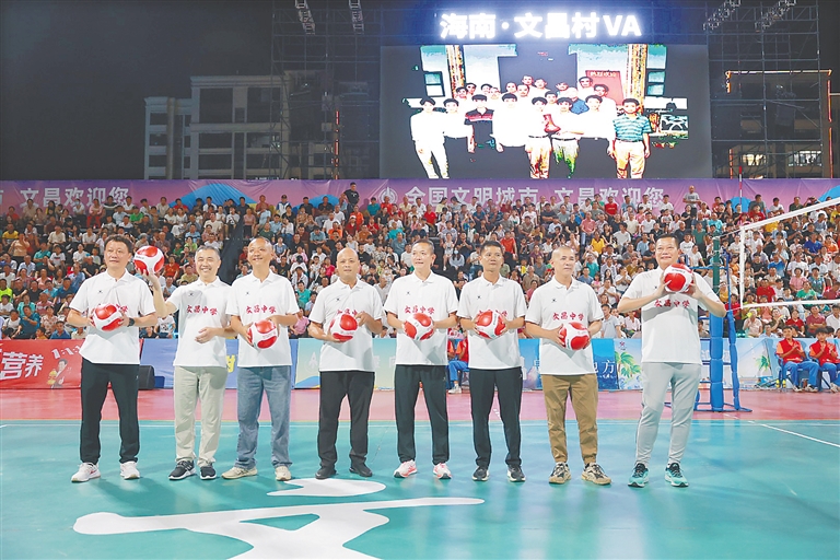 7月25日晚,海南“村VA”——“九九杯”海南(文昌)乡镇排球联赛文城站揭幕活动现场,韩旭章、吴育全、李春、黄彬、范高忠、廖奎增、林方团、潘伟——文昌中学男子排球队的8名前队员刚一现身,现场便爆发出雷鸣般的掌声。