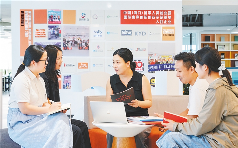 7月29日,位于海口复兴城园区的中国海口留学人员创业园内,企业人员在讨论工作。据了解,该创业园于2022年3月挂牌运营,采用“政府引导,市场运作”模式运营,被评为“国家海外人才离岸创新创业基地”和“国家级科技企业孵化器”。截至目前,创业园已吸纳留学回国人员200余人,带动就业600余人,正助力海南自贸港汇聚国际化人才。