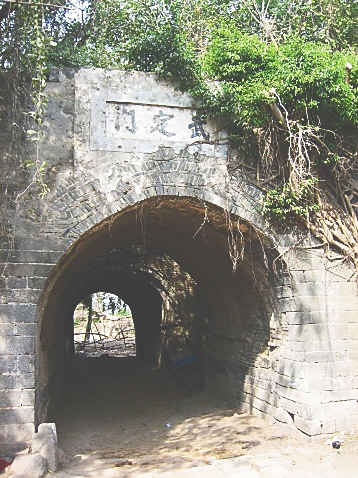 沿着光滑的石板街,穿过中和古城衙门遗址里三棵浓密高大的酸梅树,驻足在城北那爬满青苔和树藤的城垣时,仿佛走入一段深邃的历史。手抚斑驳的青砖城墙,仰望城门上裸露的白底黑字“武定门”,一种凝重的沧桑感。