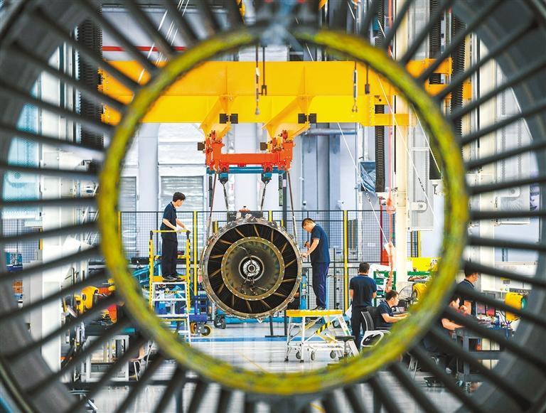 6月18日拍摄的海口空港综合保税区海口美兰空港吉耐斯航空发动机维修工程有限公司车间,工作人员对航空发动机进行质检。苏弼坤摄(中经视觉)