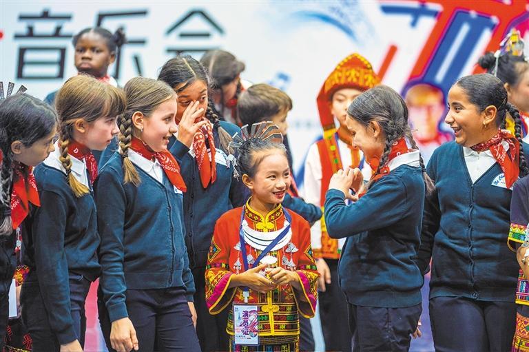 海南省歌舞剧院,五指山黎苗童声合唱团的小演员与巴黎宝丽声童声合唱团愉快交流(摄于2024年10月2日)。