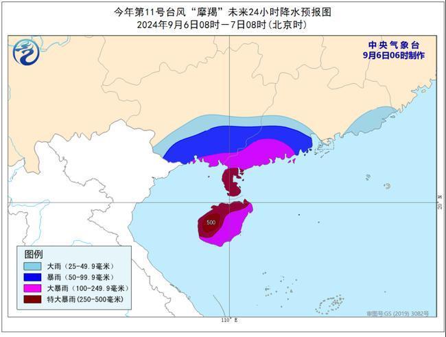 降水预报:9月6日8时至7日8时,广西东南部、广东西南部和海南岛等地有大到暴雨,其中部分地区有大暴雨,广东西南部沿海、海南岛中西部和北部局地特大暴雨(250~500毫米)。