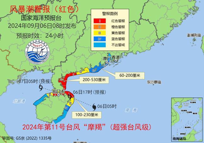 受今年第11号台风“摩羯”(超强台风级)的影响,预计9月6日上午至7日上午,广东珠江口到阳江沿海将出现60到200厘米的风暴增水,广东茂名到雷州半岛东岸沿海将出现200到530厘米的风暴增水,海南岛北部沿海将出现100到230厘米的风暴增水。