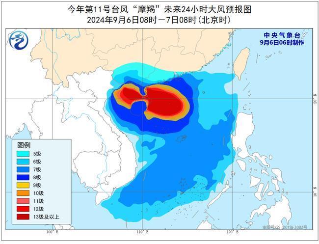 大风预报:9月6日8时至7日8时,南海大部、广东西南部及广东沿海、海南岛及其沿海、广西南部及其沿海将有6-8级大风,南海北部和中部的部分海域、北部湾、琼州海峡、广东西部沿海、海南岛北部和东部沿海将有9-12级大风,“摩羯”中心经过的附近海域或地区风力可达13-17级以上。