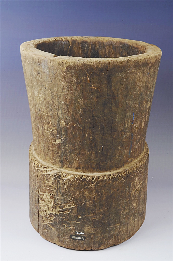 在海南省博物馆“仙凡之间”海南风情陈列展中,一组黎族木臼、木杵古朴而独特。木臼高约一米,配套的木杵接近成人高,因长期使用杵身中段留下了磨痕。这是黎族群众平日里使用的舂米工具,也是他们“三月三”跳舂米舞的道具。