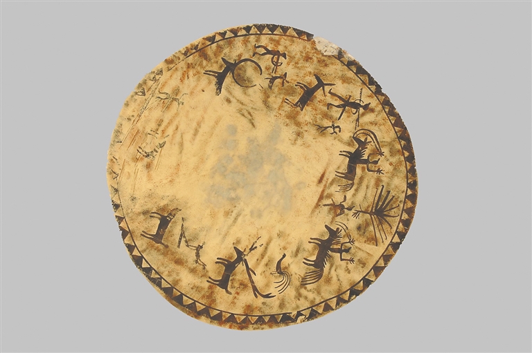 现代黎族独木牛皮鼓狩猎图鼓面拓片。