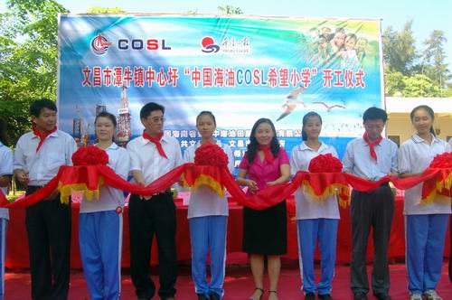 据徐雄飞副总裁介绍,这次在海南开工建设的希望小学,是COSL公司在海南省援建的第一所希望小学,是公司发起的在全国范围实施捐助希望工程、援建希望学校公益活动的一部分。为做好这项公益活动,公司专门成立了公益慈善工作委员会,并制定了工作章程。中海油田服务股份有限公司共向我省希望工程捐助800万元,第一期计划在文昌、定安、澄迈、保亭、陵水援建五所“中国海油COSL希望小学”,五所学校总捐资420万元。今后,将根据各市(县)申报的学校情况继续建设第二批学校。学校建成之后,公司将不断跟踪服务,除在学校的电脑、体育设施、音乐器材等硬件上继续投入外,还将在教师培训,贫困生资助等方面给予帮助,使“中国海油COSL希望小学”成为农村学校中的典范。