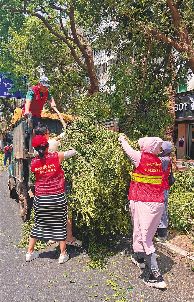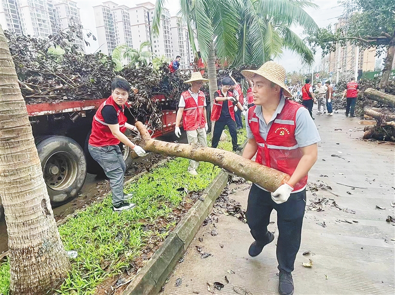 9月8日,海口市建国路,志愿者参与灾后重建工作。海南日报全媒体记者 张茂 摄