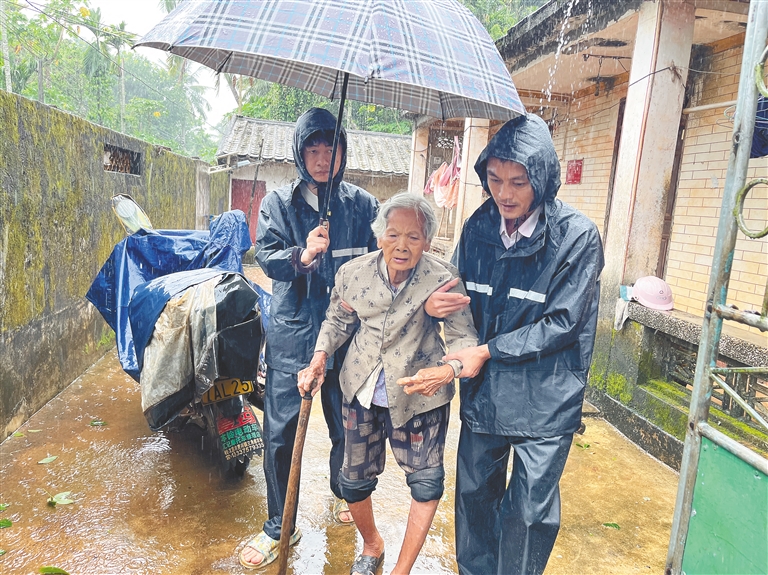 九月六日上午,文昌市重兴镇干部和派出所民警转移群众前往安置点。(重兴镇政府供图)