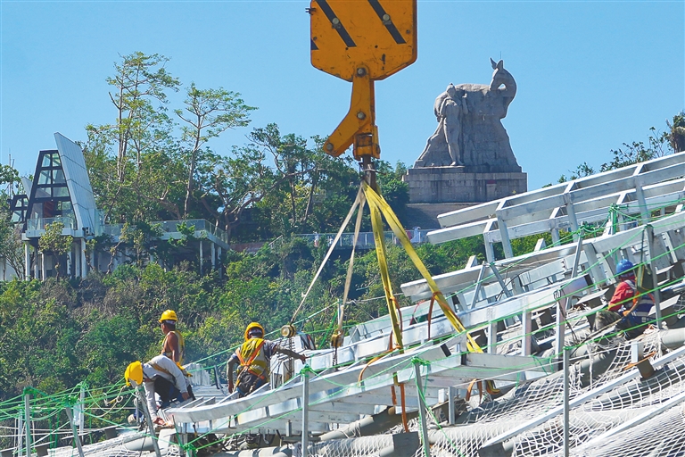 10月3日,中国海南国际文物艺术品交易中心项目和海南国际文化交流中心项目施工现场,工人们坚守岗位加快推进项目建设。