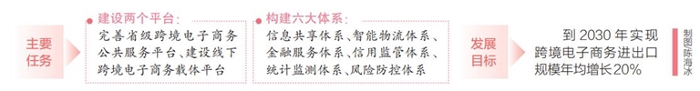 在主要任务方面,我省将建设两个平台、构建六大体系。两个平台建设包括完善省级跨境电子商务公共服务平台、建设线下跨境电子商务载体平台。构建六大体系包括信息共享体系、智能物流体系、金融服务体系、信用监管体系、统计监测体系、风险防控体系等建设内容。