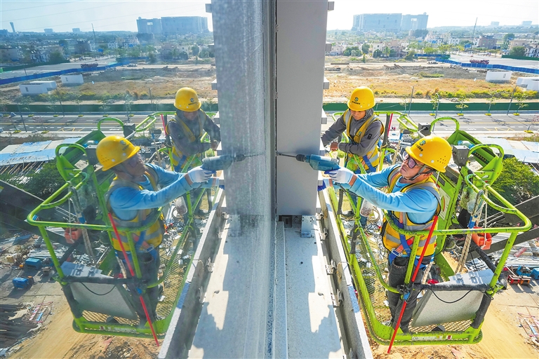 2月10日,三亚崖州湾科技城综合医院项目施工现场,工人在安装幕墙。
