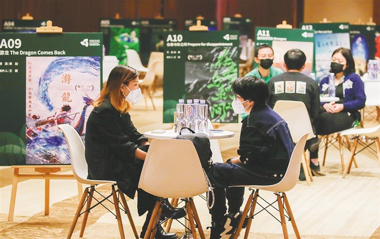第四届海南岛国际电影节H!Action创投会上,年度入围项目方和产业嘉宾进行项目洽谈。