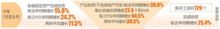 产业投资拉动力提升,得益于重点行业投资发展强劲。产业投资继续发挥引擎作用,占投资比重明显提升,带动全省投资较快增长。1月至8月,产业投资(不含房地产开发)较去年同期增长38.0%,高出全省投资增速22.4个百分点,同比增速较1月至7月提高1.6个百分点;较2019年同期增长94.5%,两年平均增长39.5%。其占全省投资的比重为29.9%,占比较去年同期提高4.9个百分点;对全省投资增长的贡献率达61.2%,拉动全省投资增长9.5个百分点。